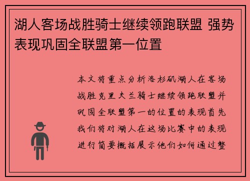 本文将重点分析洛杉矶湖人在客场战胜克里夫兰骑士,继续领跑联盟并巩固全联盟第一的位置的表现。首先,我们将对湖人在这场比赛中的表现进行简要概括,展示他们如何通过整体实力压制对手,取得了关键胜利。接着,我们将从四个方面详细阐述湖人如何在本赛季展现出强大的竞争力,继续稳居联盟第一。具体分析将从球队的核心阵容、战术执行、球员表现以及防守端的优势等方面展开。通过这些分析,我们能够清晰看到湖人如何通过细致的团队合作与战略部署,稳稳坐上联盟头把交椅。最终,文章将总结湖人这一波强势表现的背后原因,以及对球队未来发展方向的预测。